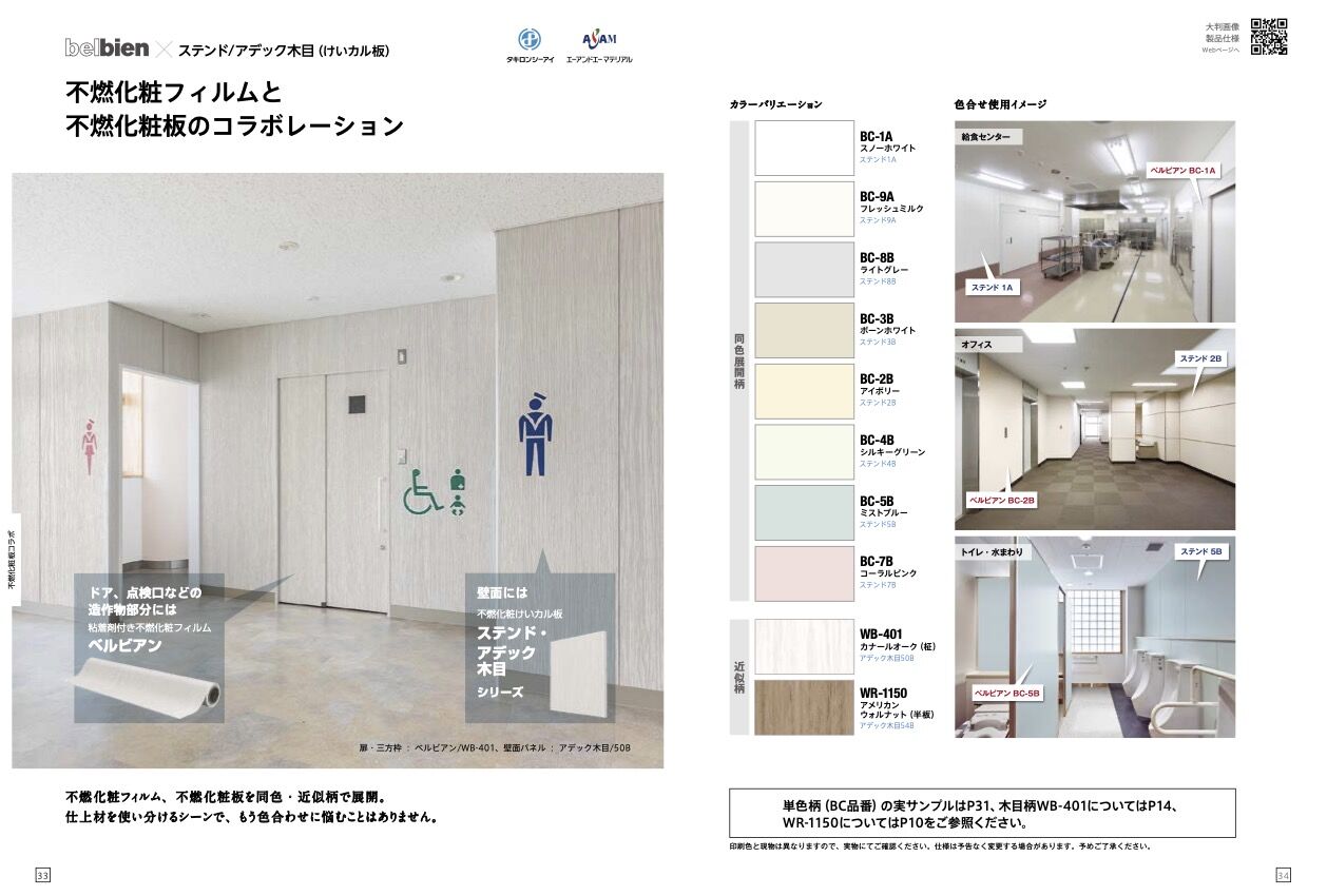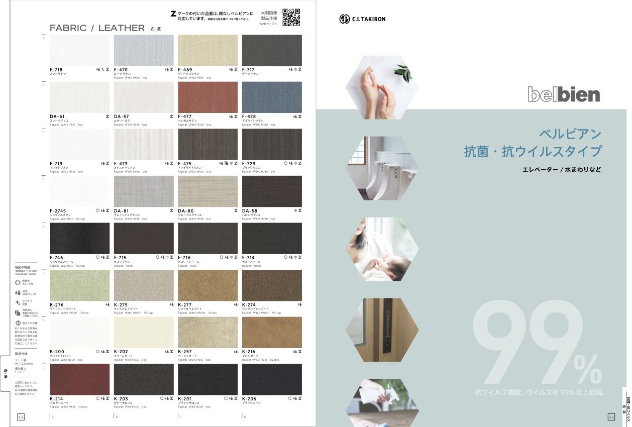 単色のシートに表情(テクスチャー)を加えた、新しいシリーズです。新技法の精密エンボス(3点)を含む11種のエンボスパターンと15色の掛け合わせで、全76柄の展開、インテリア空間に馴染みやすいベルビアンならではのセレクトです。